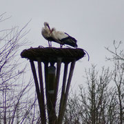 Sinds enkele dagen vliegen er weer ooievaars af en aan op de paal in het waterwingebied. Er zijn er drie tegelijk gespot tijdens het snoeien zaterdagochtend. Zaterdagmiddag deed een stelletje een nummertje en pikten ze wat in het nest. De zondagse storm weerhield ze niet van een tweede nummertje tot grote opwinding van de spelende kinderen. Vastgelegd op de film (zie hieronder).